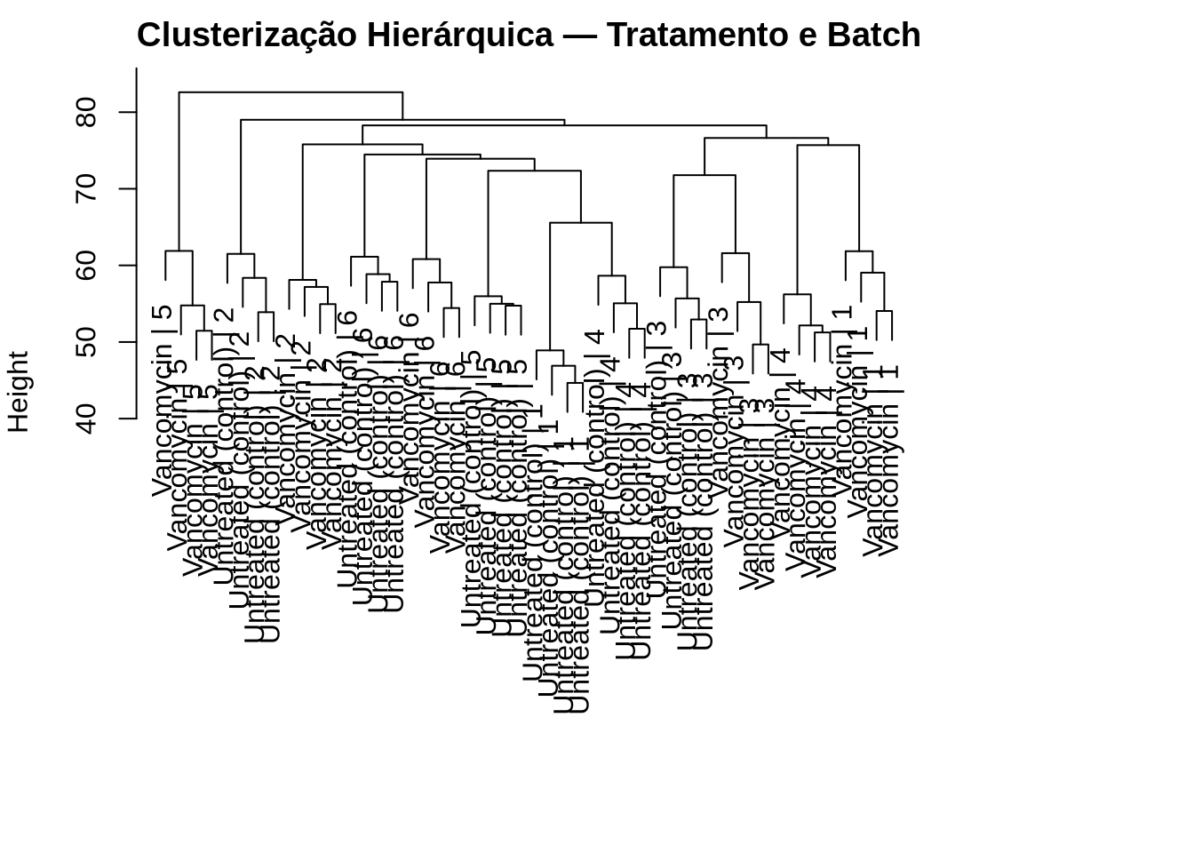- Se os genes DEG segregam perfeitamente as amostras por tratamento, isso confirma que o sinal biológico é forte e consistente entre os lotes.