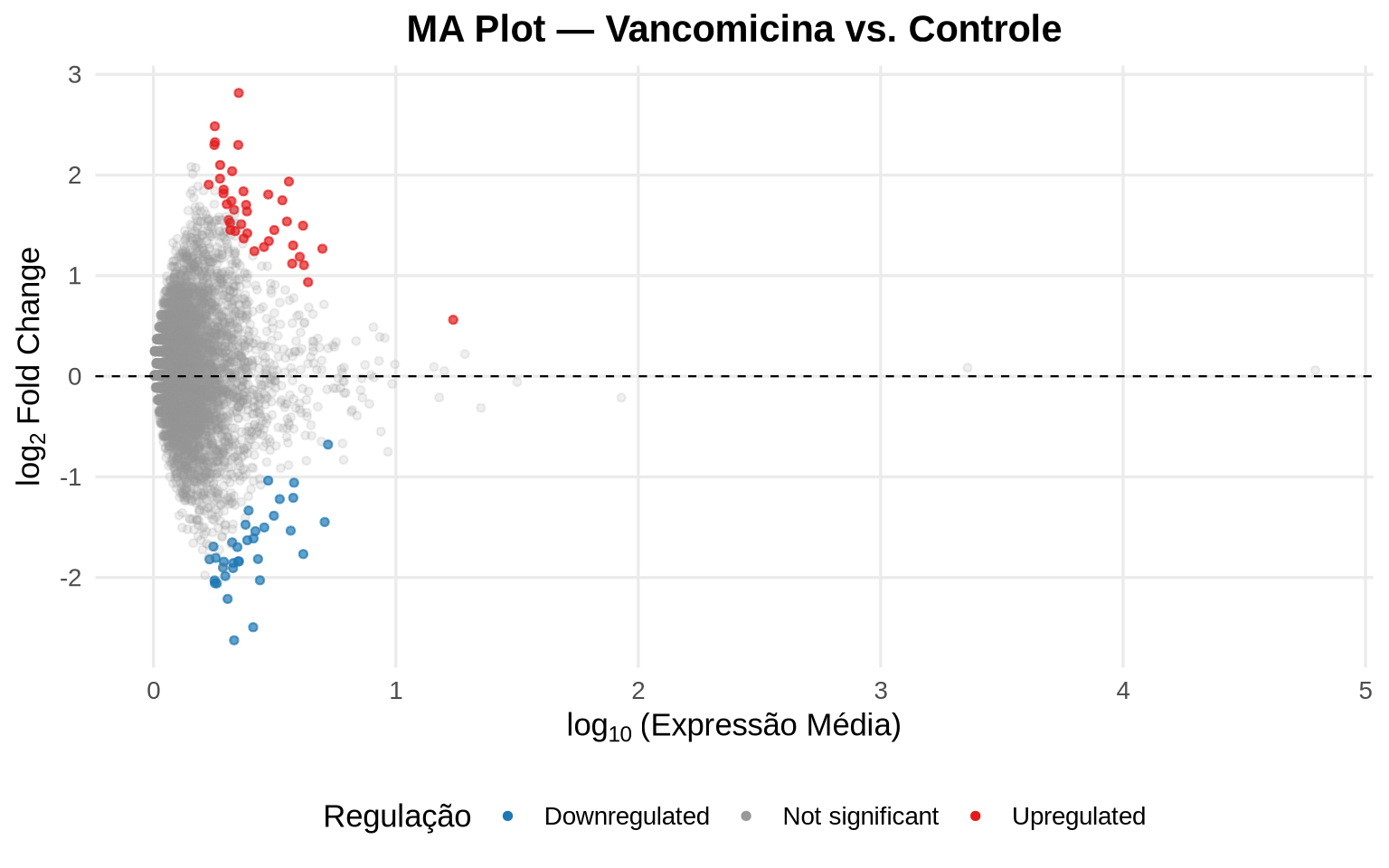 - Eixo X (log2FC): genes à direita estão upregulados sob o tratamento de vancomicina; genes à esquerda estão downregulados.