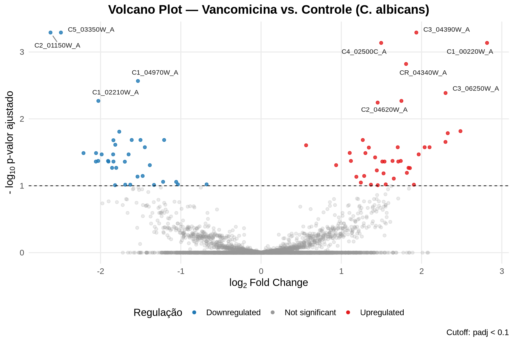 Observe a distribuição entre upregulados e downregulados. Se o tratamento com vancomicina remodela a resposta transcricional da Candida, esperamos ver genes envolvidos em resistência a estresse, remodelamento da parede celular e virulência entre os mais significativos. Genes de housekeeping devem permanecer na região cinza central.