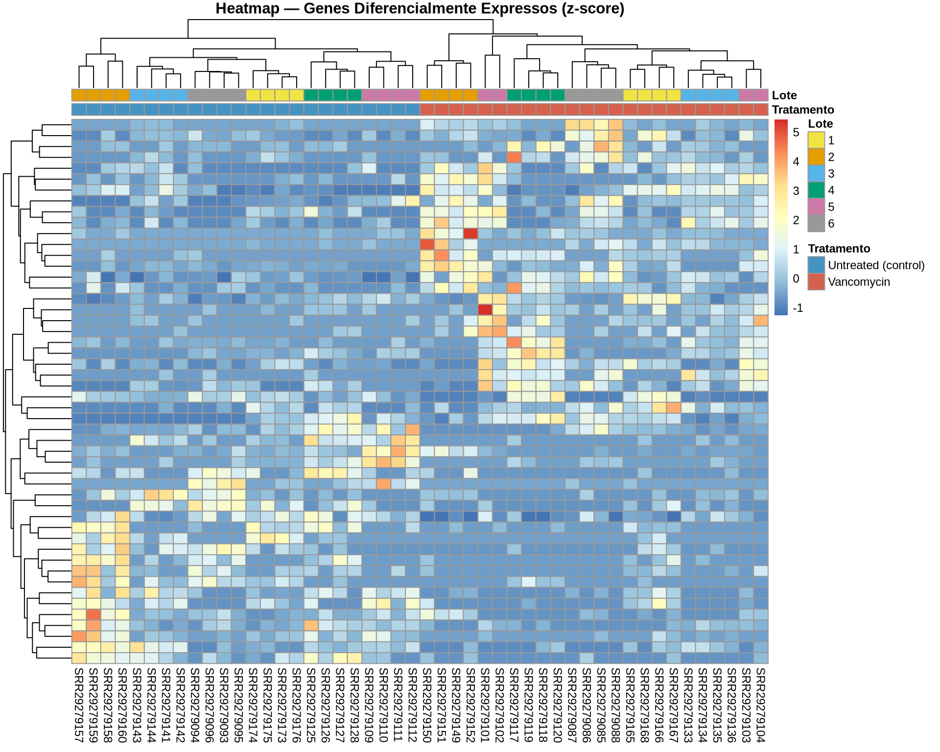 O heatmap nos permite visualizar o padrão de expressão dos genes significativos em todas as amostras simultaneamente. Para isso, utilizamos os valores de expressão normalizados transformados em z-score (escala por gene), o que evidencia as diferenças relativas entre condições.