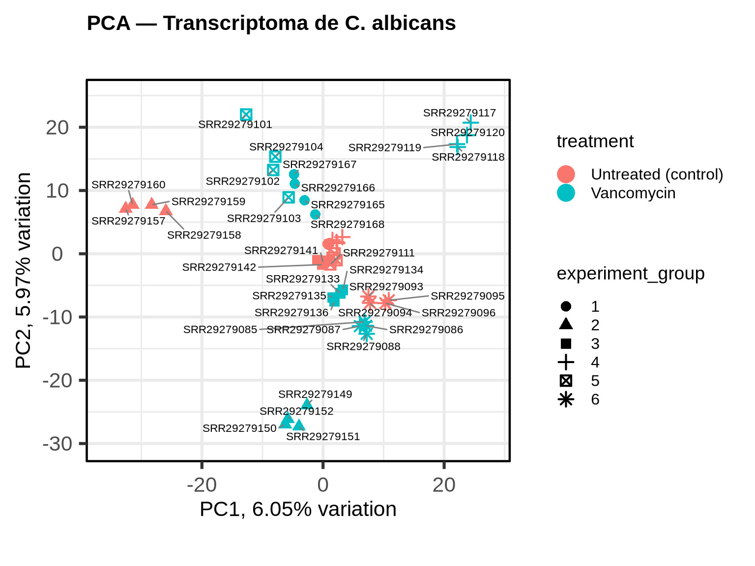Além da variável de interesse (treatment), nosso metadado contém uma informação crucial: o lote experimental (experiment_group). Como vimos na descrição do conjunto de dados, o experimento foi conduzido em 6 lotes independentes, cada um contendo 4 amostras tratadas com vancomicina e 4 controles. Diferenças entre lotes, como variações no dia de cultivo, preparo de reagentes ou condições de extração, podem introduzir variabilidade que não é interessante para o objetivo do estudo. Se não levarmos isso em conta, corremos o risco de confundir efeito de batch com efeito do tratamento, o que pode gerar tanto falsos positivos quanto falsos negativos nos resultados da expressão diferencial.
