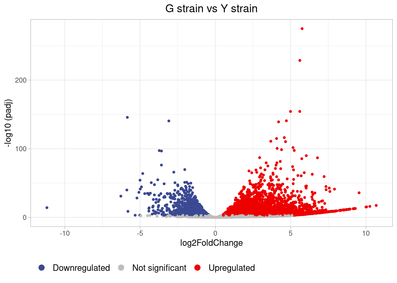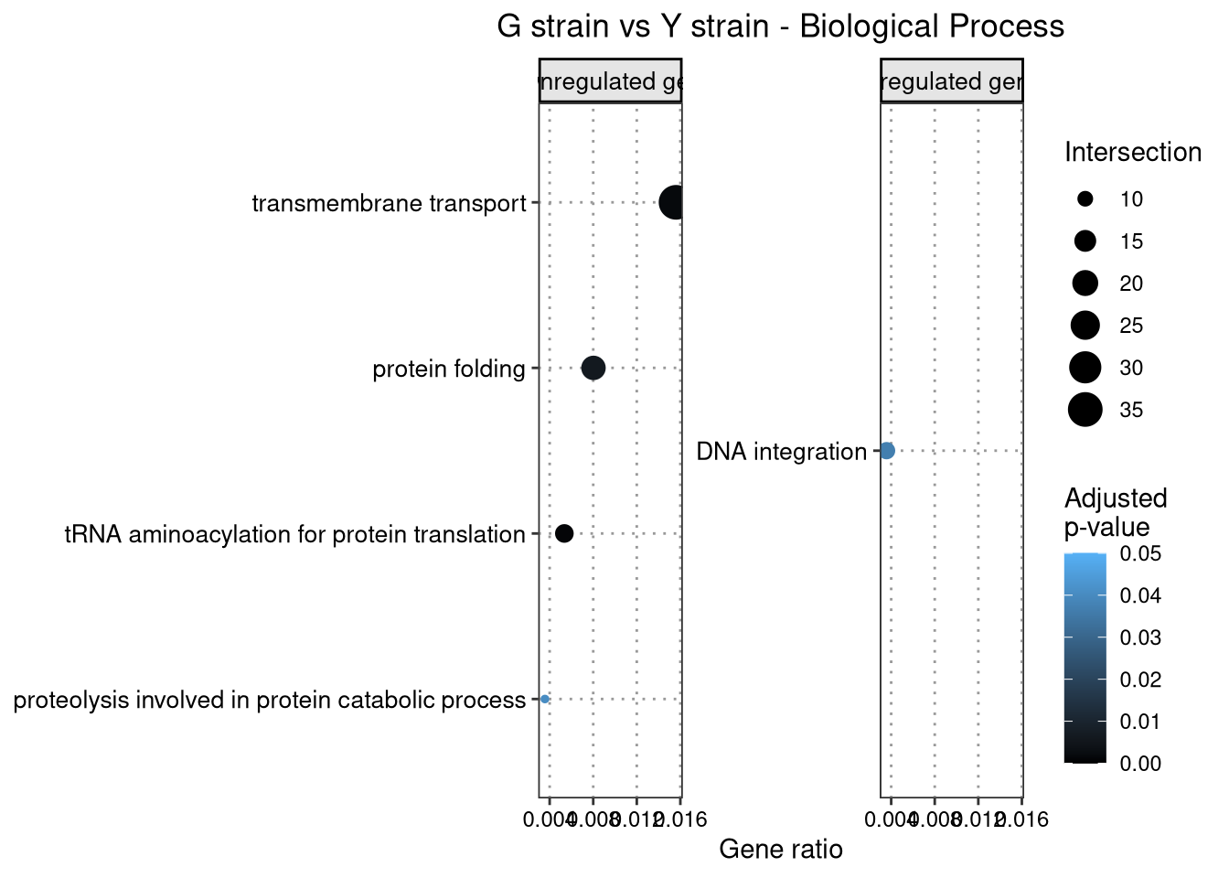 p_bp <- create_ora_plot (bp_up, bp_down, title = "G strain vs Y strain - Biological Process" )